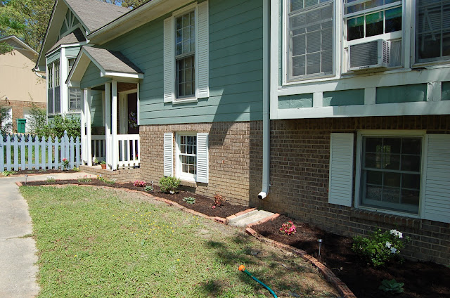 Here's a picture of the side bed on the left side of the entrance walk. I weed whacked, removed the abandoned fire ant nest, and tilled the area to create the planter. Again, I laid the black planting plastic and planted the plants around it.
